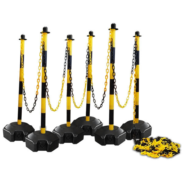 De set bestaat uit zes stevige zwart-gele kunststof kettingpalen van 90 cm hoog. Deze palen zijn extra stevig dankzij het kruisvormige binnenwerk, waardoor ze bestand zijn tegen verschillende weersomstandigheden en langdurig gebruik.