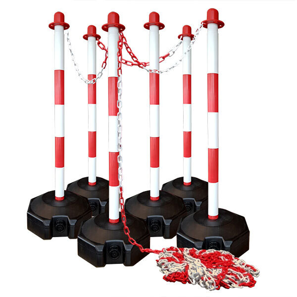 De set bestaat uit zes stevige rood-witte kunststof kettingpalen van 90 cm hoog. Deze palen zijn extra stevig dankzij het kruisvormige binnenwerk, waardoor ze bestand zijn tegen verschillende weersomstandigheden en langdurig gebruik.
